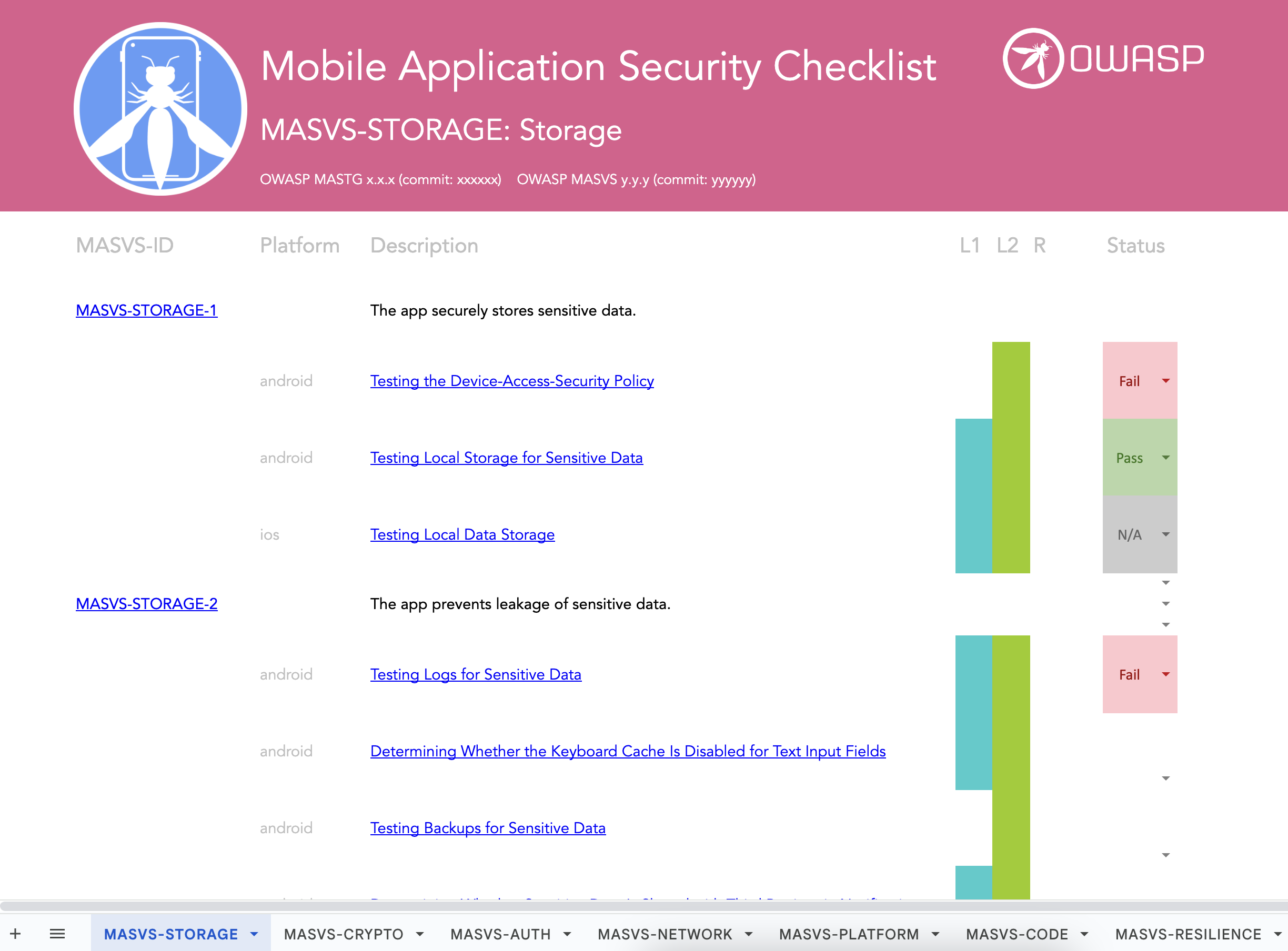 O projeto flagship de Segurança de Aplicações Móveis (MAS) da OWASP fornece um padrão de segurança para aplicativos móveis (OWASP MASVS), uma lista de fragilidades comuns de segurança e privacidade específicas para aplicativos móveis (OWASP MASWE) e um guia abrangente de testes (OWASP MASTG) que cobre os processos, técnicas, ferramentas e casos de teste que permitem aos testadores entregar resultados consistentes e completos.