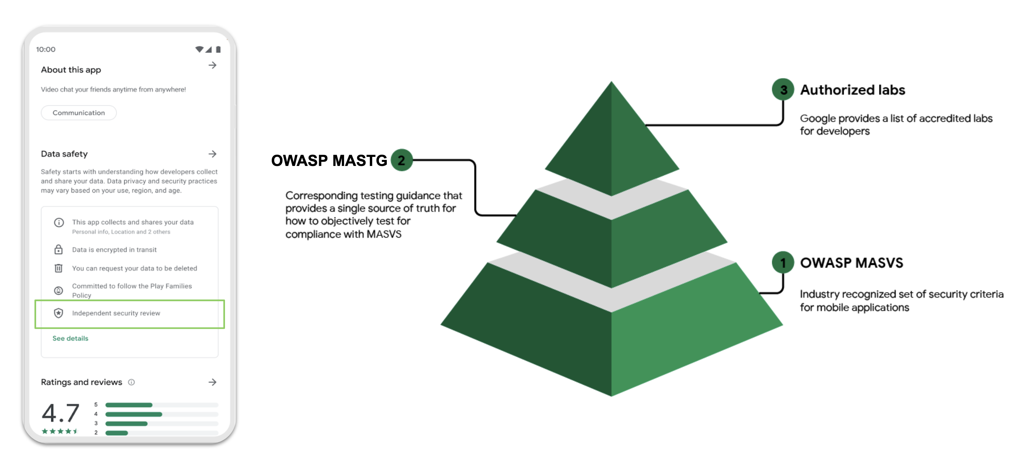 Como parte do processo para fornecer mais transparência na arquitetura de segurança do aplicativo, o Google introduziu o programa MASA (Mobile Application Security Assessment) como parte da App Defense Alliance (ADA). Como o MASA é um padrão globalmente reconhecido para segurança de aplicativos móveis no ecossistema de aplicativos móveis, o Google está reconhecendo a importância da segurança neste setor. Os desenvolvedores podem trabalhar diretamente com um parceiro Laboratório Autorizado para iniciar uma avaliação de segurança que é validada independentemente contra um conjunto de requisitos do MASVS Level 1, e o Google reconhecerá esse esforço permitindo que eles divulguem esses testes na seção de Data Safety do aplicativo.