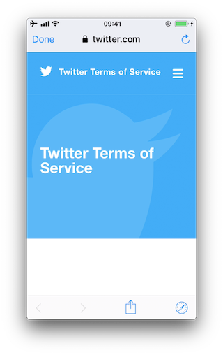 SFSafariViewController está disponível a partir do iOS 9 e deve ser usado para fornecer uma experiência generalizada de visualização web. Esses WebViews podem ser facilmente identificados, pois possuem um layout característico que inclui os seguintes elementos: