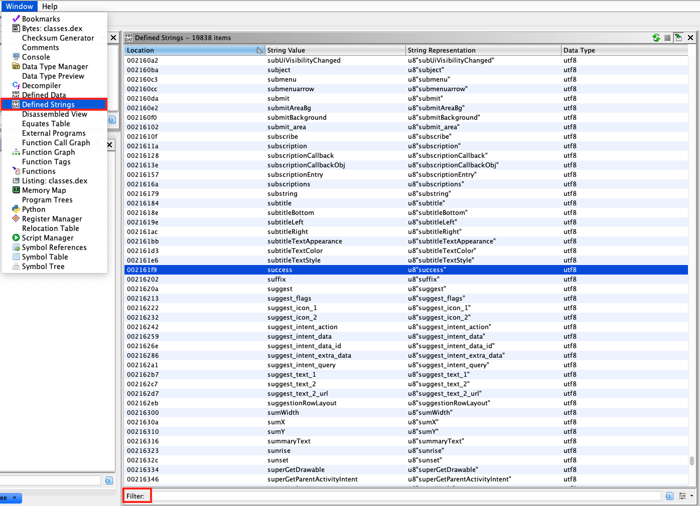 Com o Ghidra, as strings podem ser obtidas carregando o arquivo DEX e selecionando Janela -> Defined strings no menu.