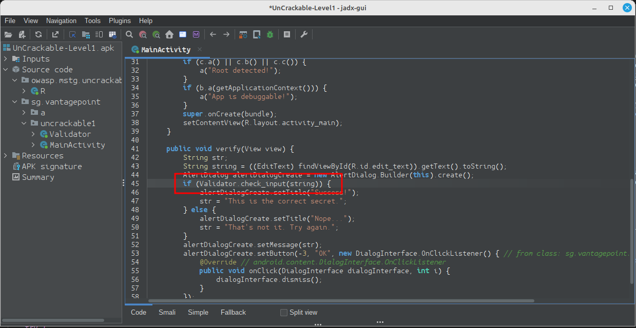 Seguindo o exemplo de Descompilação de Código Java, assumimos que você decompilou e abriu com sucesso o aplicativo Android UnCrackable L1 no jadx. Quando o jadx terminar de decompilar, você pode navegar pelas classes decompiladas selecionando-as na árvore de arquivos. Observe que muitos dos pacotes, classes e métodos decompilados possuem nomes estranhos de uma letra; isso ocorre porque o bytecode foi "minificado" com o ProGuard durante o build. Este é um tipo básico de ofuscação)) que torna o bytecode um pouco mais difícil de ler, mas com um aplicativo simples como este, não causará muitos problemas. No entanto, ao analisar um aplicativo mais complexo, isso pode se tornar bastante incômodo.