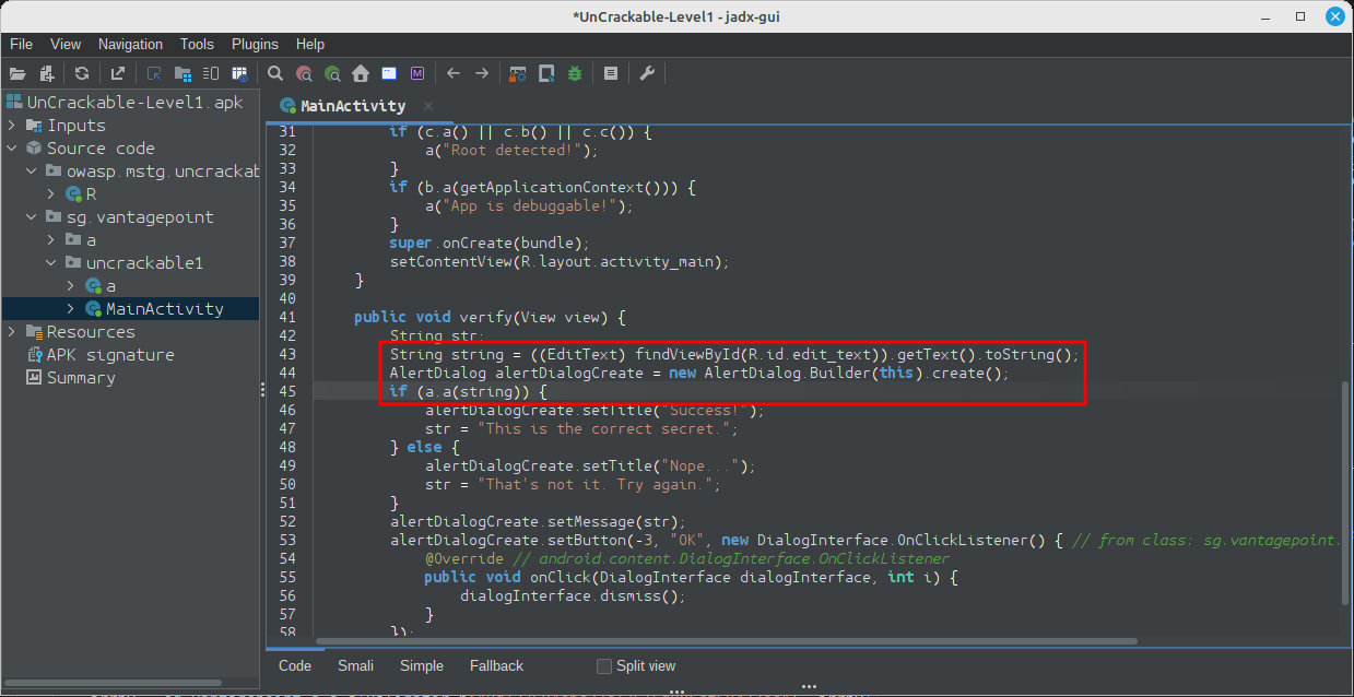 Ao analisar código ofuscado, é uma boa prática anotar nomes de classes, métodos e outros identificadores à medida que avança. Abra a classe MainActivity no pacote sg.vantagepoint.uncrackable1. O método verify é chamado quando você toca no botão "verify". Este método passa a entrada do usuário para um método estático chamado a.a, que retorna um valor booleano. Parece plausível que a.a verifique a entrada do usuário, então refatoraremos o código para refletir isso.