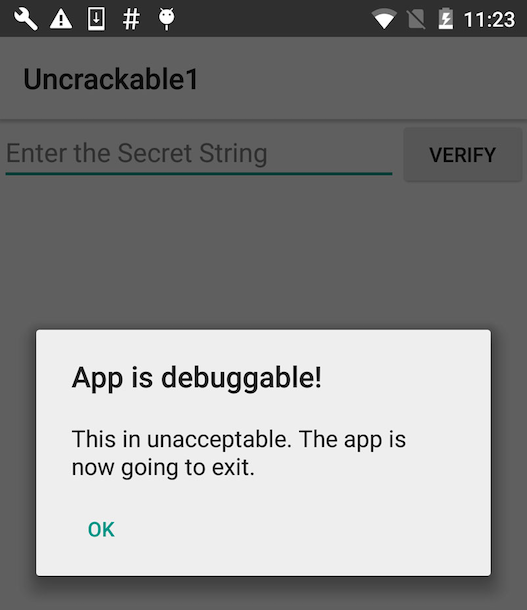 Android UnCrackable L1 não é burro: ele percebe que foi executado em modo depurável e reage encerrando sua execução. Um diálogo modal é exibido imediatamente, e o crackme termina assim que você toca em "OK".