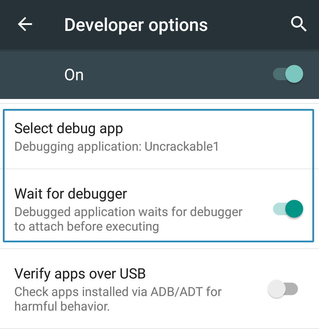 Nas Opções de desenvolvedor, selecione Uncrackable1 como o aplicativo de depuração e ative a opção "Aguardar depurador".