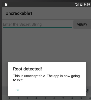 Quando você inicia o aplicativo crackme em um emulador ou dispositivo com root, perceberá que ele apresenta uma caixa de diálogo e fecha assim que você pressiona "OK" porque detectou root: