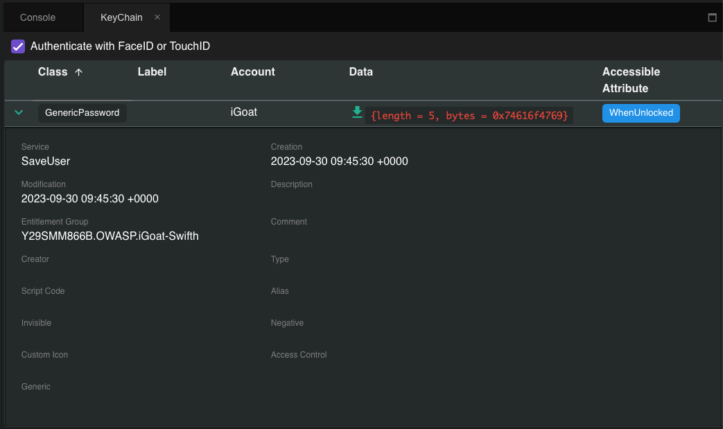 Por fim, como o despejador do keychain é executado a partir do contexto do aplicativo, ele imprimirá apenas os itens do keychain que podem ser acessados pelo aplicativo e não todo o keychain do dispositivo iOS.