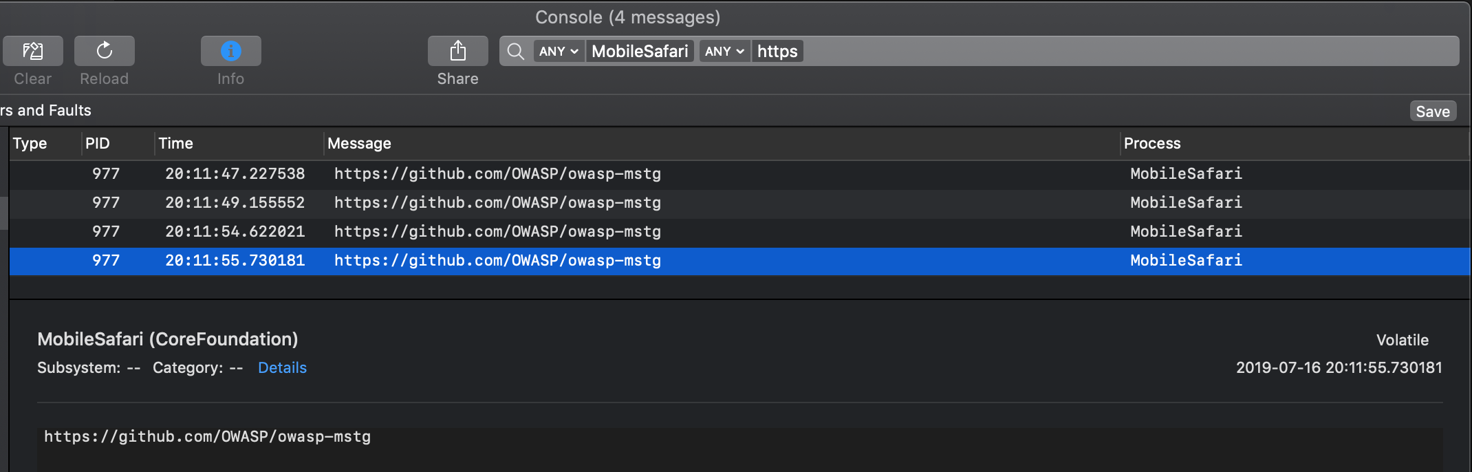 Inicie o Safari no dispositivo iOS. Execute o script Python acima no seu host conectado e abra o log do dispositivo (conforme explicado na seção "Monitoring System Logs" do capítulo "iOS Basic Security Testing"). Tente abrir um novo URL no Safari, por exemplo, https://github.com/OWASP/mastg; você deverá ver a saída do Frida nos logs, assim como no seu terminal.