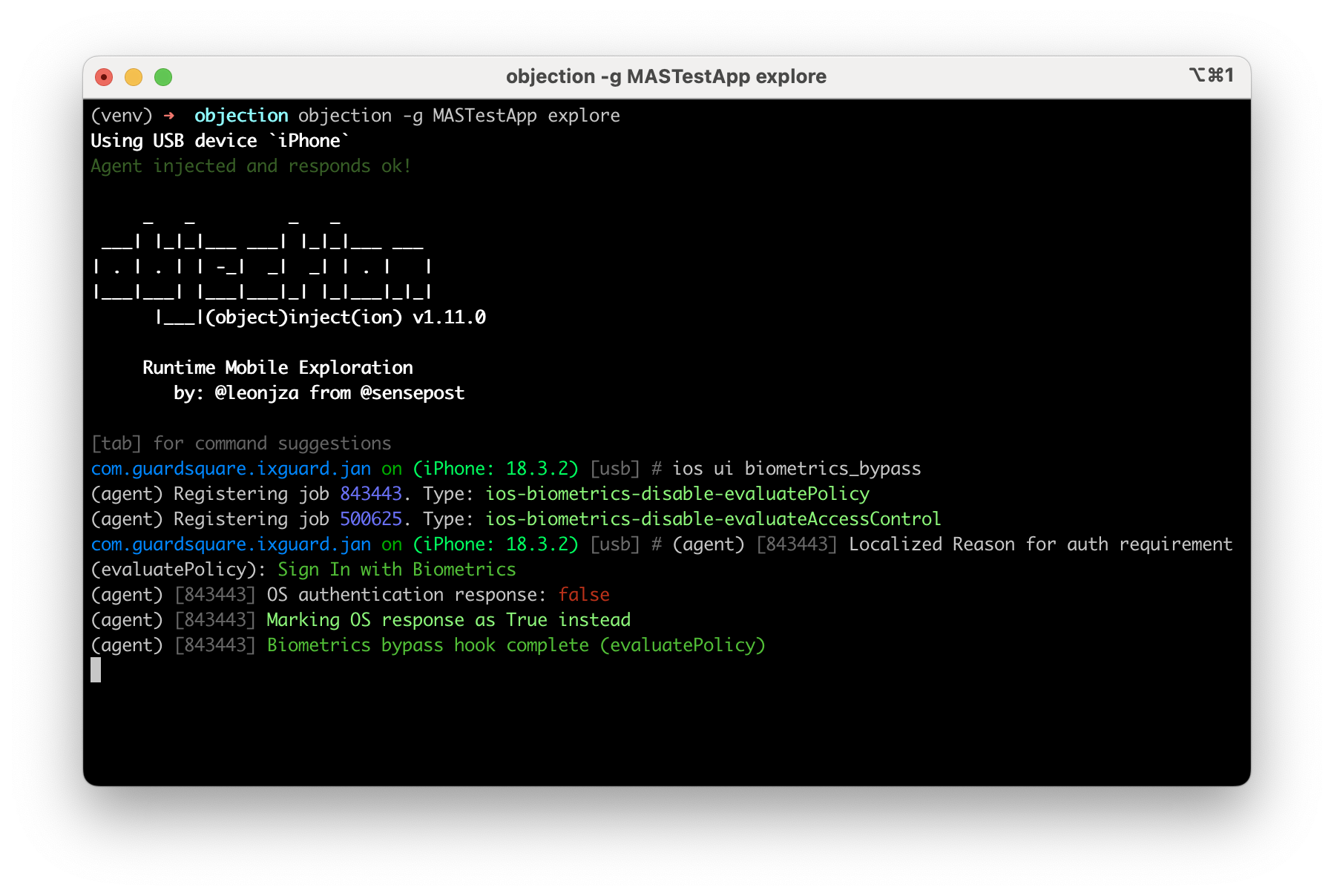 Se você tiver um dispositivo com jailbreak e o frida-server instalado, pode contornar a autenticação biométrica executando a ferramenta objection com o comando ios ui biometrics_bypass: