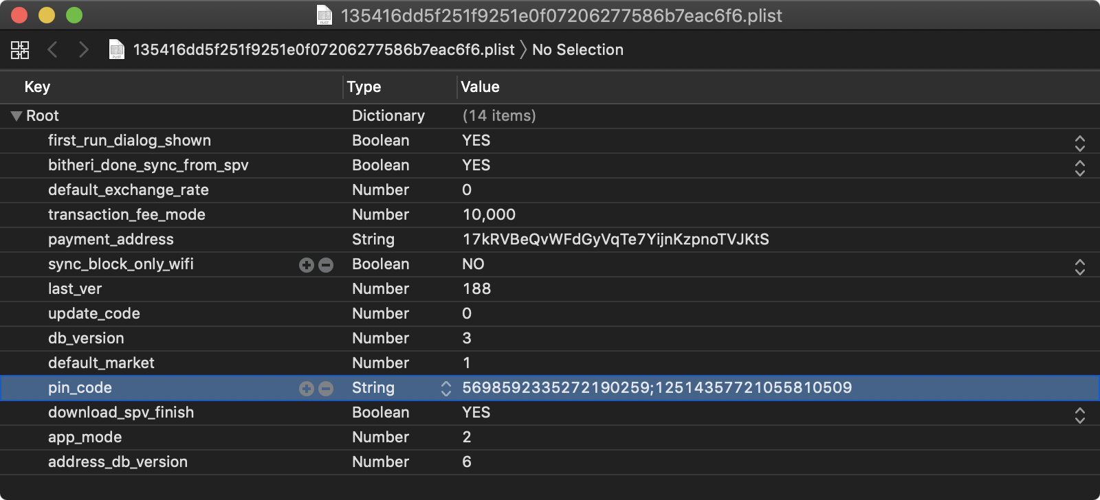 É aqui que você pode começar a analisar os arquivos em busca de dados sensíveis. Na captura de tela, você verá o arquivo net.bither.plist que contém o atributo pin_code. Para remover a restrição de bloqueio de interface, simplesmente exclua o atributo pin_code e salve as alterações.