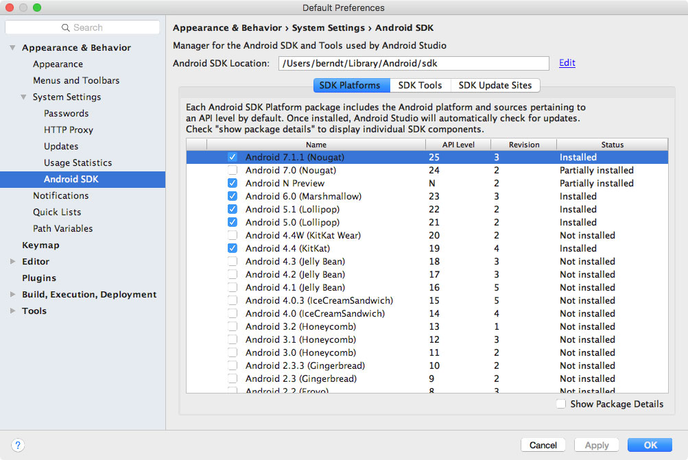 As instalações locais do Android SDK são gerenciadas pelo Android Studio. Crie um projeto vazio no Android Studio e selecione Tools -> SDK Manager para abrir a interface gráfica do SDK Manager. A aba SDK Platforms é onde você instala SDKs para múltiplos níveis de API. Os níveis de API recentes são:
