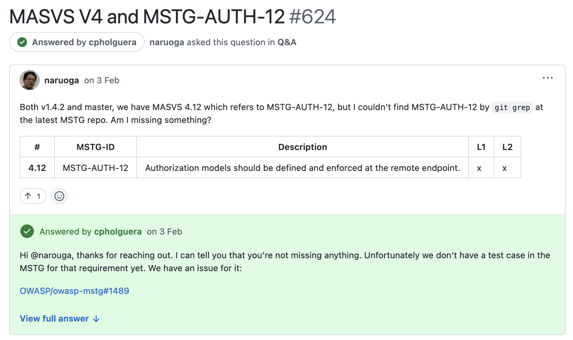 Por exemplo, você pode iniciar uma discussão como "Adicionar uma vulnerabilidade sobre rotação de chaves" para o MASWE ou "Adicionar um caso de teste para rotação de chaves no Android" para o MASTG.