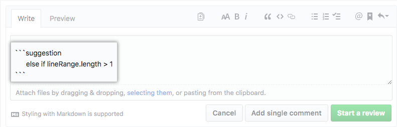 Comente em um PR usando comentários de linha única ou múltiplas linhas (clique e arraste para selecionar o intervalo de linhas):